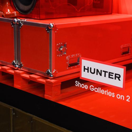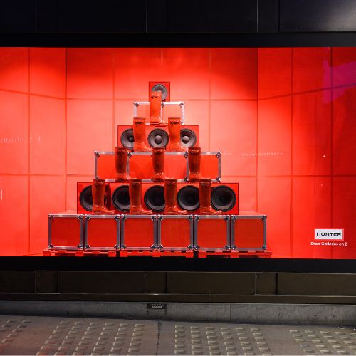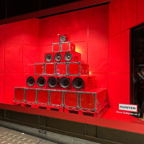 The display celebrates urban energy and amplified British spirit. The pyramid os speakers symbolizes the power of sound and culture, echoing Hunter’s connection to music festivals, outdoor adventure and bold self-expression