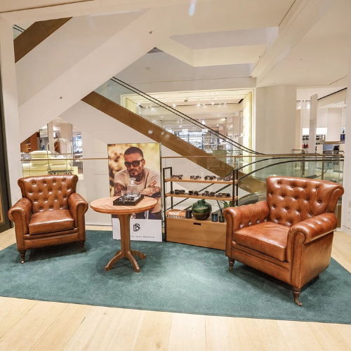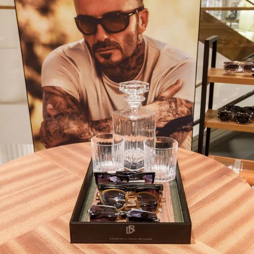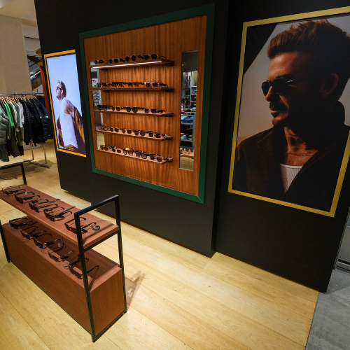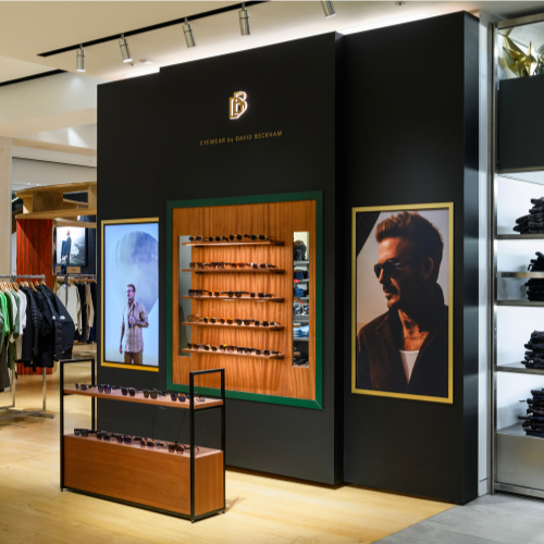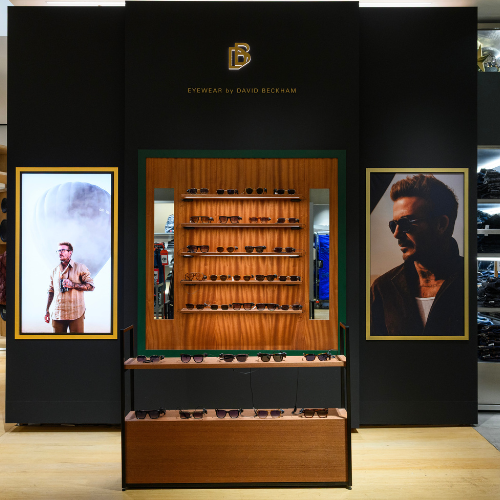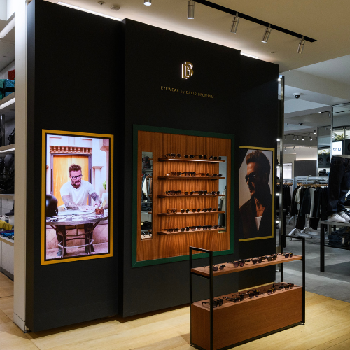 A sleek, masculine pop-up corner designed to showcase David Beckham sunglasses at Selfridges. The display balances luxury and approachability, creating an immersive brand experience for customers in a high-traffic retail environment